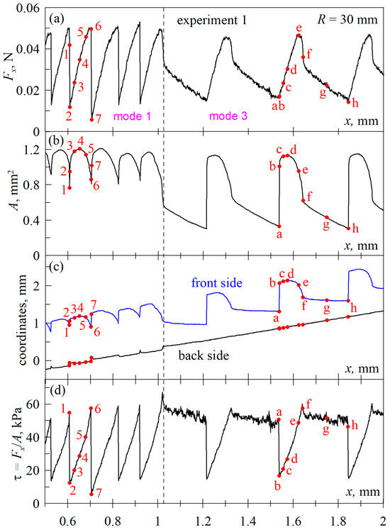 Figure 5 shows the dependencies corresponding to the first experiment, the data of which are presented in Figure 2 and Figure 4. In Figure 5, the region of the dependencies in which the transition between modes “mode 1” and “mode 3” takes place is depicted in detail. Additionally, Figure 5 shows the dependencies for the coordinates of the front and back contact edges, as well as the average value of the tangential stresses τ = Fx/A. Note that the difference between the “front side” and “back side” coordinate values in Figure 5c at each fixed indenter coordinate x is the contact width measured in the direction of indenter motion. In the case of a circular contact, the width thus measured will coincide with its diameter.