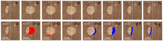Top row of figures: photographs of the contact areas corresponding to points (a–h) shown in Figure 5. Bottom row: the same photographs as in the top row, but where colors show the differences between the contact areas, where blue shows the area that came out of contact and red shows the area that came into contact (except for the first panel “a”, which coincides with the corresponding image in the top panel). For example, figure “b–a” shows the difference between figures “b” and “a” on the top panel, figure “c–b” shows the difference between the contact areas in figures “c” and “b”, etc. A supplementary video (Video S1) is available for the figure.