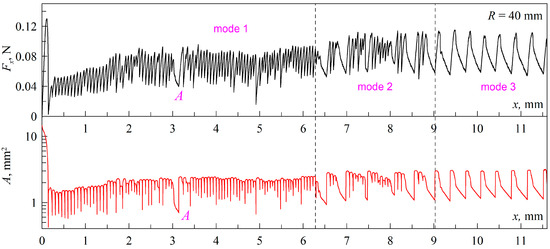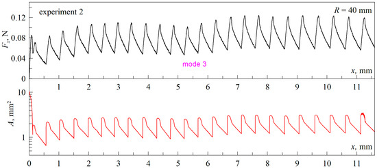 Above, Figure 3b shows the dependencies of the normal force FN on the indentation depth d in the phase of pulling the indenter out of the elastomer volume, where the lower curve corresponds to the experiment, the data of which are shown in Figure 8. A second experiment was performed immediately after this experiment, and the upper curve in Figure 3b shows the normal force dependence in this experiment. From the comparison of the dependencies shown in Figure 3b, it follows that the adhesion force in the second experiment was significantly lower. Dependencies of friction force Fx and contact area A for the second experiment with indenter with a radius R = 40 mm are shown in Figure 9, from which it follows that here the stable “mode 3” was realized. This fact confirms the conclusions made above in the discussion of Figure 3a that the transition between “mode 1” and “mode 3” is caused by contamination of the indenter surface and a decrease in the specific work of adhesion.