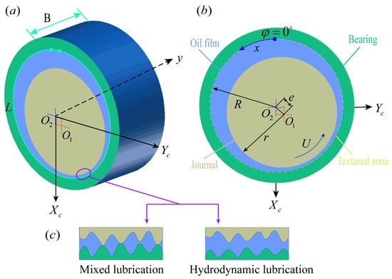 (a,b) Schematic of a textured journal bearing system; (c) overview of the lubrication regimes.