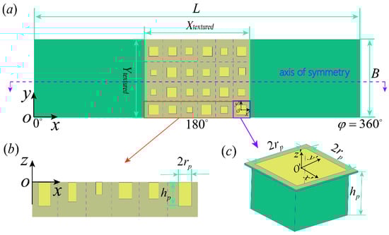 The oil film thickness is established using the clearance between the journal and the bearing, and its proper characterization is particularly important for lubrication analysis. Since this article focuses on the lubrication characteristics of journal bearings under transient conditions, the journal position continues to change over time under the action of variable loads, which in turn affects the oil film thickness. In addition, as shown in Figure 2a, square textures are introduced on the bearing surface, which will also lead to changes in the oil film thickness. The reason for choosing a square texture is that the adaptive scale texture optimization design method was adopted in this work, in which the depth and width of each texture are variable. Compared to other shapes of textures, square textures have consistent side lengths, allowing for fewer parameters to be introduced into the design variables. As a result, the computational workload of simulation and optimization can be reduced. Therefore, the corresponding expression of the oil film thickness is expressed as follows: