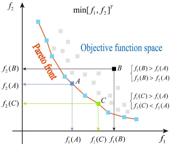 As shown in Figure 3, both objective functions and aimed to achieve minimum values. When comparing solutions A and B, if is smaller than and is also smaller than , it indicates that solution A outperforms solution B in terms of overall performance, meaning that solution A dominates solution B, while solution A is not dominated by solution B. Additionally, when comparing solution A with solution C, even though is less than since is greater than , solution C cannot claim to dominate solution A. In this scenario, a special relationship known as non-domination arises between solutions A and C. The set of points corresponding to all non-dominated solutions in the objective space constitutes the so-called Pareto front. These non-dominated solutions may represent the best choices when pursuing multi-objective optimization strategies, as they offer a balance across multiple objectives without being simultaneously outperformed by any other solution in all objectives.