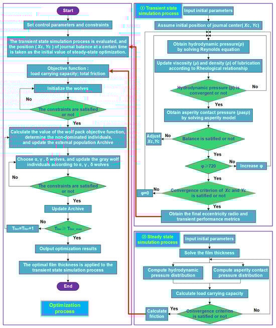 To address the optimization problem related to texture scales, this study employed an optimization model based on the grey wolf optimizer (GWO) algorithm [29,30] and integrated it with the mixed lubrication model. This approach aims to collectively enhance the performance of the journal bearing system. The GWO algorithm, inspired by the hunting behavior of grey wolves in nature, mimics their prey-hunting tactics within the search space. Due to its robust global optimization capabilities and swift convergence, the GWO algorithm has gained widespread recognition and application.