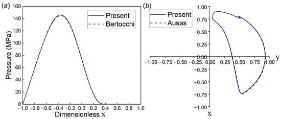 To ensure the correctness and accuracy of the researched model, this study conducted model validation on both steady-state and transient-state simulations using the two cases shown in Figure 5. For the steady-state validation, the published work by Bertocchi et al. [34] was used as a reference, with the same simulation conditions maintained. As shown in Figure 5a, the results of hydrodynamic pressure obtained from the current model are highly consistent with those in the literature. For the transient-state validation, a dynamically loaded journal bearing case studied by Ausas et al. [35] was utilized, and the comparison results are shown in Figure 5b. It can be observed that the computed results using the current model closely match the research results of Ausas et al., further confirming the reliability of the numerical model.