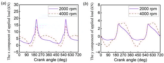 As discussed in the following sections, the mixed lubrication model of the journal bearing system was employed to conduct a transient simulation. The novel adaptive scale texture optimization approach was introduced to explore the friction reduction effect of surface texture under engine-like conditions. The geometric and operating parameters required for transient simulation are listed in Table 1 and Table 2, respectively. At the same time, the simulation work also considered the influence of different applied loads. Figure 6 shows the changes in applied load under low-speed (2000 rpm) and high-speed (4000 rpm) conditions. These data were obtained from the kinetic equation of the mechanism and combustion gas pressure experiments [36]. Additionally, in order to exclude the influence of grid size on the simulation results, 340 × 16, 680 × 32, 1360 × 64, and 2720 × 128 grids were used in the study. The difference between the results of 1360 × 64 and 2720 × 128 grids was within 2%, so the 1360 × 64 grid was chosen to balance the computational accuracy and efficiency.
