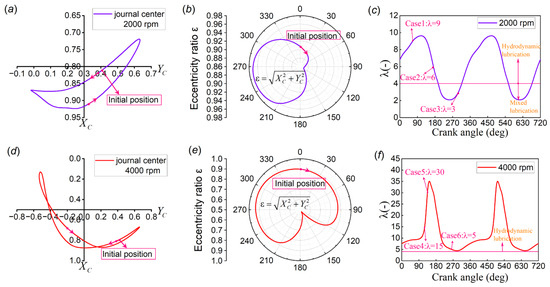 Results of untextured journal bearing system at 2000 : (a) journal center position; (b) eccentricity ratio; (c) film thickness ratio. Results of untextured journal bearing system at 4000 : (d) journal center position; (e) eccentricity ratio; (f) film thickness ratio.