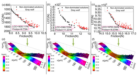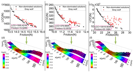 Figure 9a–c show the non-dominated solution sets obtained through the multi-objective optimization of the load-carrying capacity and friction for Case 4, Case 5, and Case 6, respectively. Figure 9d–f show the corresponding optimal square texture contours for Case 4, Case 5, and Case 6, respectively. It can be seen that there are differences in the optimal textures of the cases, and these differences may be the result of adjustments made to achieve the better load-carrying capacity and friction. In combining the data in Table 3 and comparing it to the untextured journal bearing system, the optimized load-carrying capacity increased by 9.31%, 1.99%, and 13.2%, and the friction was reduced by 6.82%, 3.42%, and 20.89% for Cases 4, 5, and 6, respectively. These optimization results show that the introduction of adaptive scale texture is effective in reducing friction and lubrication.