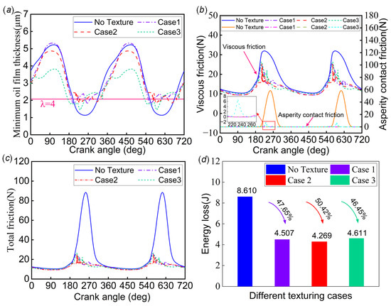 The operation of a journal bearing system is a dynamic process whereby the load is balanced by constantly adjusting the position of the journal center. The optimum texture at a particular journal center position is not the best choice at other positions, but it is still a better choice. Therefore, the square textures obtained from the optimization of Case 1, Case 2, and Case 3 were subjected to transient simulations at 2000 rpm for evaluation. Figure 10a shows a comparison of the minimum oil film thicknesses for the untextured and textured systems. In the hydrodynamic lubrication stage, the application of surface texture leads to a decreasing trend in the minimum oil film thickness. This phenomenon does not completely indicate that it is unfavorable to the system. The minimum oil film thickness is different from the oil film thickness. The local oil film thickness of the textured system may be higher than that of the untextured system. It is necessary to consider the global range of the oil film thickness. In the mixed lubrication phase, the system-containing textured profiles had a boost to the minimum oil film thickness, and the minimum oil film thickness varied erratically in this phase. Figure 10b shows the results of the variations in viscous friction and asperity contact friction for the untextured and textured systems; all the bearings with textures had less viscous friction than in the untextured case. Case 3 had the least viscous friction when the crank angle was between 0 degrees and 23 degrees and 263 degrees and 360 degrees. Case 2 had the least viscous friction when the crank angle was between 24 degrees and 262 degrees. The textured system also shows a substantial reduction in asperity contact friction compared to the untextured system. Figure 10c depicts a comparison between the untextured and textured systems regarding total friction, illustrating that adaptive square texturing is beneficial for friction reduction. Figure 10d shows a comparison between the untextured and textured systems regarding energy loss. Among all the cases, the texture of Case 2 produced the best tribological performance as it possessed the lowest value of energy loss, which was reduced by 50.42% as compared to the untextured cases.