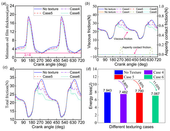 The same approach was taken to evaluate the square texture obtained from the optimization of Cases 4, 5, and 6 by subjecting them to transient simulations at 4000 rpm. Figure 11a shows a comparison between untextured and textured journal bearing systems in terms of the minimum oil film thickness. It is concluded that the application of the textured bearing system in the hydrodynamic lubrication stage leads to a reduction in the minimum oil film thickness. This is consistent with the results in the previous subsection. It should be noted that the texture application in Case 5 resulted in mixed lubrication in a system that originally experienced only a hydrodynamic lubrication regime. This needs to be evaluated further using the performance metrics on friction in Figure 11b,c. It was found that only Case 5 had a limited asperity contact friction in the process, and the total friction was still dominated by viscous friction. Combined with Figure 10b, it can be found that the total friction force at 4000 rpm was lower than that at 2000 rpm. This result indicates that under the current specific operating conditions, maintaining the system at a higher rotational speed helps reduce the asperity contact friction. Figure 11d compares the energy loss of the untextured and textured journal bearing system systems. The results show that Case 4, Case 5, and Case 6 reduced the energy loss by 5.80%, 1.93%, and 11.03%, respectively. The texturing in Case 6 resulted in lower energy loss values.