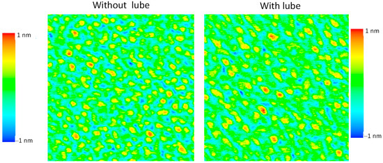 Figure 2 is an example of AFM images of a 500 MB/platter magnetic disk surface around 2015 before and after lubricant coating in an area of 250 nm × 250 nm. The shape of the DLC and lubricant coated surface is dominated by that of the magnetic particles. The asperity density is around 5000 μm−2 with roughness (standard deviation) Sa = 0.22 nm (0.021 nm), Sq = 0.28 nm (0.026 nm) and maximum peak height = 1.24 nm (0.10 nm). The average peak height of the asperities and the depth of the pits are approximately 0.5 nm (0.17 nm) [9]. As can be seen from Figure 2, with lubricant, the pit depth becomes shallower and the radius of curvature of the pits becomes larger as the lubricant molecules fill the valley bottom and the radius of curvature of the asperities also increases slightly. As the total lubricant thickness is about 1~1.8 nm, it is thicker to fill the valleys between the asperities and the thin lubricant molecular chains are assumed to cover the DLC surface on the asperity surfaces [6]. The equivalent radius of curvature of the asperities, which is related to the asperity contact and surface forces, is about 15 nm [9].