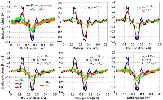Equation (9) was then used to simulate the replenishment behavior of the depleted scar shown in Figure 3a using the Hamaker constant A = 0.5 × 10−19 J/m2, the bulk viscosity of Z-tetraol μm = 1 Pa·s, and monolayer thicknesses hm = 1.7 nm and d0 = 0.2 nm. Figure 3c shows the calculated results when the viscosity ratio is rμ = 0.3. Similar results to Figure 3b were obtained using the actual viscosity. In this case, the wall surface viscosity μ0 is 3.3 times the bulk viscosity. Considering that Z-tetraol has two OH groups at each end of the main chain, this is compatible with Mate’s experimental results for Z-dol with one OH group at each end. However, the replenishment speed of Δh96 in Figure 3c is also higher than that of the experiment in Figure 3a. Therefore, the depleted scar in Figure 3a was considered to contain a worn bonded layer caused by repeated contact of the head. Figure 3d shows the calculated result when rμ = 0.3 and the worn bonded layer hbw was assumed to be Δh96/5. In addition, the results for rμ = 0.4 and hbw = Δh96/4 and Δh96/3 are shown in Figure 3e and Figure 3f, respectively. It can be seen that the theoretical replenishment characteristics at rμ = 0.4 and hbw = Δh96/3 in Figure 3f are in fairly good agreement with the experiment in Figure 3a.