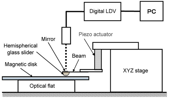 Diagram of experimental setup for measurement of collision motion of hemispherical slider on magnetic disk surface (Reproduction of figure 1 in [46]).