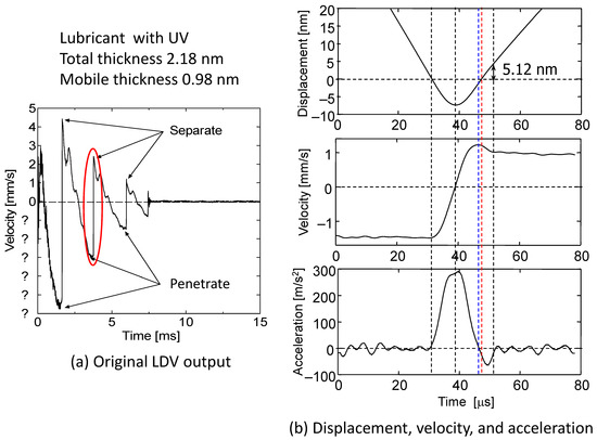 Figure 7 shows the measured bounce motion of slider 1 as it collided with a disk surface with a lubricant film of LT = 2.18 nm in w/ UV. Figure 7a shows the velocity waveform measured by LDV. In general, a glass sphere bounced 1–5 times after the first collision with a disk surface. Because the upper side of the velocity is positive, the minimum negative value corresponds to the point at which it contacts the disk surface and begins to penetrate, while the maximum positive value is the point at which it separates from the disk surface after receiving elastic deformation energy due to contact. The region indicated by the red line circle is therefore the period during which the spherical slider is in contact with the disk surface. When the time axis in this region is zoomed in and plotted on a time scale of μs, the velocity waveform becomes as shown in Figure 7b. If this velocity waveform is integrated with time, it becomes the displacement waveform in the top panel, and if differentiated with time, it becomes the acceleration waveform in the bottom panel. The exact identification of the contact initiation position is determined by a simulation of the collision phenomenon [46]. The figure shows that at time t = ~30 μs, the slider surface enters the disk surface with zero displacement at a negative velocity of −1.7 mm/s, and after about 8 μs it penetrates to a depth of −7 nm at zero velocity due to the elastic reaction force of the disk surface. The velocity then increases due to the elastic reaction force, and when the acceleration reaches zero at the maximum velocity (blue dashed line), the sphere is slightly embedded in the disk surface. It is assumed that the sum of the disk elastic reaction force and the meniscus attraction force is zero at this point. When the sphere is at the disk surface (red dashed line), the velocity decreases slightly due to the negative force, and it is expected that the meniscus attraction force is stronger than the elastic reaction force in this small region. When the sphere moves away from the disk surface, the negative acceleration due to meniscus attraction increases and the velocity decreases to a minimum value, and when the sphere moves 5.12 nm away from the disk surface, the meniscus breaks and the velocity becomes constant and the acceleration decreases to noise level. Under these experimental conditions, the thickness of the mobile layer is 0.98 nm, which means that about two thirds of monolayer film thickness of AM3001 lubricant is present and a meniscus is formed during an elastic contact time of about 17 μs. According to Hertz’s contact theory, when the indentation depth is 7 nm, the contact radius is 2.6 μm. The maximum negative acceleration is 60 m/s2, which, multiplied by the mass of the spherical slider of 5 mg, gives a dynamic attractive force of 0.3 mN, which is slightly greater than the static pull-off force.
