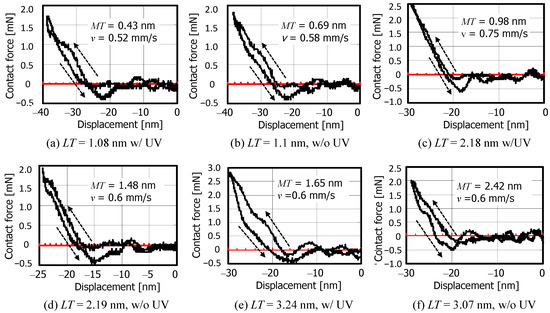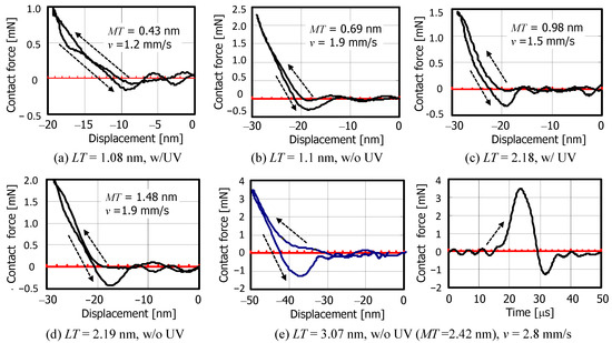 Figure 8 shows the measured dynamic indentation characteristics of the R1 slider when colliding with various lubricant thicknesses. The contact force was calculated by multiplying the acceleration by the mass of the slider. The collision tests were performed starting with disks with a thinner mobile lubricant film, and 15 trials were performed for each test disk. The test results with the lowest vibration noise are shown here. When LT = 1.08 nm, MT = 0.43 nm and w/ UV, no particular surface forces were observed in the first collision test, even at the lowest collision velocity. Figure 8a shows the dynamic indentation characteristics when the collision velocity was reduced to v = 1.2 mm/s in the fourth loading test. The arrows indicate the penetration and separation processes. A small attractive force is observed during the separation, and it is possible that the lubricant on the disk surface adheres to the sphere surface after repeated collision tests, resulting in an easier meniscus formation. However, when LT = 1.1 nm, MT = 0.69 nm and w/o UV, an attractive force almost equal to 4πRγ = 0.27 mN was clearly generated during separation at any collision velocity from the first collision, as shown in Figure 8b. An equivalent attractive force was also generated during the separation process in the case of LT = 2.18 nm, MT = 0.98 nm, and w/o UV as shown in Figure 8c. For LT = 2.19 nm, MT = 1.48 nm and w/o UV, a larger attractive force of 0.4 mN was generated as shown in Figure 8d. Although not shown here, the indentation characteristics for LT = 2.24 nm, MT = 1.65 nm and w/ UV were also the same as in Figure 8d. Although the attraction waveform contains cantilever vibration noise, it can be said that the van der Waals force is below the level of the noise component, as no particular attraction is observed during penetration. Figure 8e shows the indentation characteristics and the time evolution of the contact force for LT = 3.07 nm, MT = 2.42 nm and w/o UV, where a large attractive force of −1.25 mN (4.5 times the pull-off force) is generated during the separation. In this case, it is considered that not only the meniscus attraction but also the fluid bearing force due to the squeezing effect is generated by the lubricating film corresponding to ~1.5 times molecule layer. As can be seen from Figure 7b and Figure 8e, the contact time of the R1 slider is about 17 μs and the action time of the meniscus attractive force is about 5 μs.