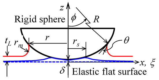 Figure 10 shows a model of a rigid sphere of radius R in contact with an equivalent elastic plane coated with a thin liquid film of thickness tL at radius rs, forming a meniscus of radius r. The line connecting the apex and the center of the sphere is the z-axis, the intersection of the z-axis and the plane before deformation is the origin, and the cylindrical coordinate system O-xφz (ξφz) is set on the plane. The red line indicates the meniscus surface, while the blue line indicates deformed elastic surface. If the meridian radius of the meniscus is rm, the indentation depth is Δ (>0) and the z-coordinate of the sphere surface is b, b(x) can be written as