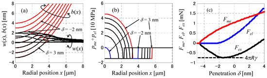 In Equation (26), using unknowns are only rs, r and c. Therefore, they can be solved using Equations (26)–(28) by the Newton-Raphson (NR) method of successive approximation. Solve for the meniscus radius r using the NR method by successively decreasing the indentation δ from larger values. A solution such that rs ≤ 0 means that there is no solid contact, so Equation (24) with zero contact pressure is used to solve for the meniscus radius r using the NR method. Although φ should be taken into account when the sphere radius is small, the calculated results when φ = 0 have been described in [56]. Because the calculation error is small for R = 2 mm, the results of the meniscus contact solutions for the case R = 2 mm are used for a better understanding of the experiments.