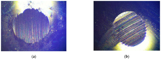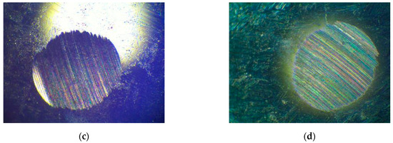 The PB index refers to the maximum load at which a steel ball does not seize under a lubrication environment at a certain temperature and speed. The PB value represented the level of load prior to a sudden change in the diameter of the steel ball’s wear spot. The higher the PB value, the better the lubrication performance of the lubrication coatings. As is shown in Figure 14 and Table 8, the GPG, TDG, and CNG spherical hinge lubrication coatings had higher maximum non-seize loads than PTG. The maximum non-seize load of PTG and GPG is 421.5 N and 455.5 N, respectively. The maximum non-seize load of GPG is 8.1% higher than that of PTG. The PB value of TDG is the largest among several coatings, 480 N, which is 13.9% higher than PTG. The PB value of CNG is 460.5 N, which is 9.3% higher than PTG. The test results indicate that the load-bearing capacity of GPG, TDG, and CNG spherical hinge lubrication coatings are improved in different degrees compared with PTG, and the TDG spherical hinge lubrication coating has the most outstanding load-bearing capacity.