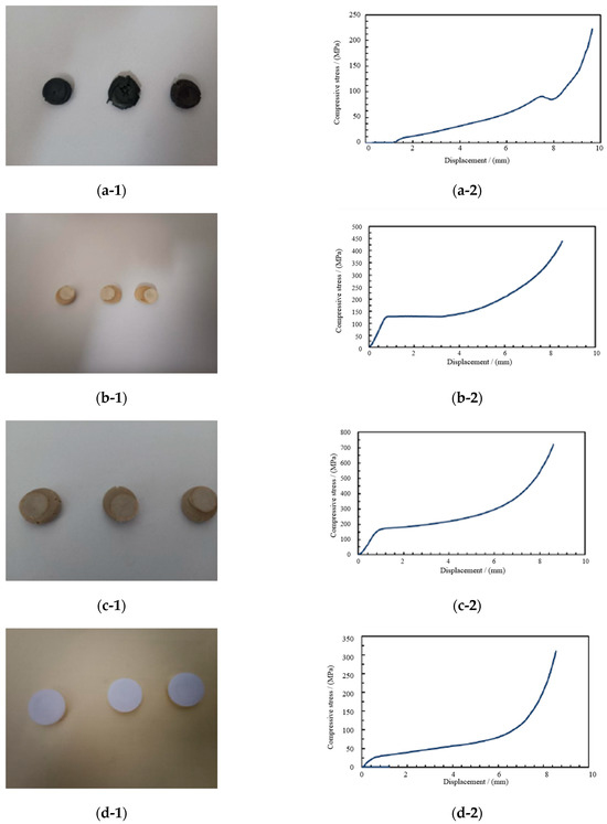 Compressive property test results of four spherical hinge slider samples. (a-1) Compressive failure of PTFE. (a-2) Stress–displacement curve of PTFE. (b-1) Compressive failure of PPS. (b-2) Stress–displacement curve of PPS. (c-1) Compressive failure of PEEK. (c-2) Stress–displacement curve of PEEK. (d-1) Compressive failure of UWHPEF. (d-2) Stress–displacement curve of UWHPEF.