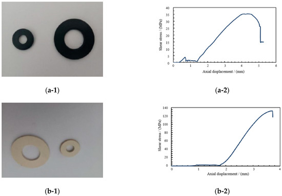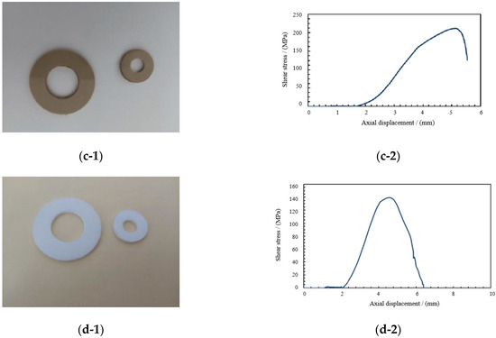 Shear property test results of four spherical hinge slider samples. (a-1) Shear failure of PTFE. (a-2) Stress–displacement curve of PTFE. (b-1) Shear failure of PPS. (b-2) Stress–displacement curve of PPS. (c-1) Shear failure of PEEK. (c-2) Stress–displacement curve of PEEK. (d-1) Shear failure of UWHPEF. (d-2) Stress–displacement curve of UWHPEF.