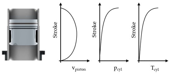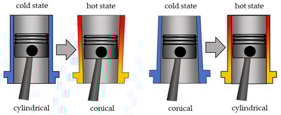 Due to inhomogeneities resulting from the overall engine construction and uneven heat sources and sinks, deformations of the cylinder liner occur. The varying temperature distribution results, on the one hand, from heat flows from combustion combined with the cycle-dependent cooling performance of the coolant mass flow and, on the other hand, from mechanical loads arising from combustion pressure and assembly [2,3,4]. However, some of these effects can be partially compensated during the production of the cylinder liner using honing processes with a pretensioned liner. Figure 2 illustrates on the left a schematic deformation of a cylinder liner in the hot state. The conical-shaped deformation causes a narrowing of the lubrication gap between the cylinder liner and the piston skirt in the region of the Bottom Dead Center (BDC). An advance approach regards this deformation with an inverse conical shape in the cold state, shown on the right in Figure 2. The advanced manufacturing process required for this is already partly applied in mass production [5].
