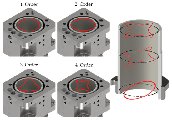 However, due to the varying wall thickness of the surrounding components and the resulting circumferentially changing heat transfer, different radial deformation forms are to be expected in the piston liner cross-section on each height (see Figure 3), which can be approximated by Fourier series [4]. During the operation of the internal combustion engine, uneven contact regions occur between the piston rings and the cylinder liner: this particularly affects the compression rings with tribological contact to the cylinder liner. In the presence of large clearances or lower-contact forces of the rings, leakages occur, negatively impacting the operation of the combustion chamber. Additionally, this can lead to oil entry into the combustion chamber (reverse blow-by) and it is one reason for higher emissions. Conversely, a tighter sealing results in a higher friction force [5,6,7,8,9,10,11,12,13,14,15,16].