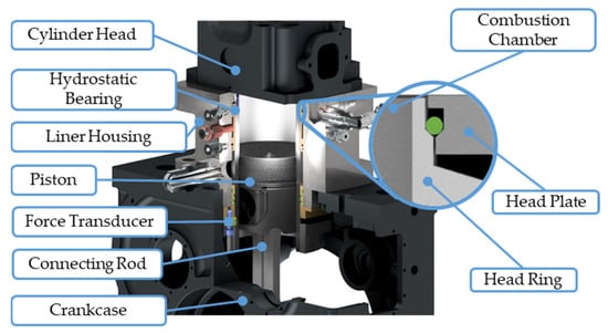 In the laboratory at Leibniz University Hannover, a Floating-Liner single-cylinder test rig has been built up in recent years for detailed friction force measurements based on a commercial vehicle engine with a 130 mm bore with basic parameters given in Table 1 [25,26,27,28]. The Floating-Liner method is a direct measurement method for determining the frictional force between the piston assembly and cylinder liner. This method is fundamentally based on a liner that can move in the direction of the stroke. The liner is mounted in the stroke direction by using force sensors, allowing the crank-angle resolved measurement of the piston friction force (cf. [29,30,31,32]). The mechanical construction of a Floating-Liner requires significant design efforts in sealing the combustion chamber and in implementing measurement technology to eliminate disturbances during the measurement process. A hydrostatic bearing serves for the radial support and axial guidance of the liner in the liner housing, absorbing the occurring radial forces. The bearing is pressurized with externally conditioned hydraulic oil, supplying the hydraulic pockets. The supplied oil is guided back to the conditioning through a circulating drainage groove in the bearing. To seal the combustion chamber without axial force from the cylinder head mounting tension, the Floating-Liner at ITV is equipped with a gas-balancing system [15,16]. This system allows the effective combustion chamber pressure in the sealing area to be compensated, preventing force impact in the stroke direction and, thus, avoiding an influence on the measurement results. To implement this system, an equivalent compensating area is provided for the area in the combustion chamber sealing region between the roof ring and roof plate (see Figure 4). After every assembly, the cylinder unit is calibrated first for statical conditions and then for dynamical cases under comparable boundary conditions to the motored engine to compensate the effect of the sealing arrangement.