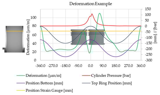 The deformation varies as a function of the piston position (green line). Essentially, it depends on three effects. Firstly, a static deformation results from the thermal influences and the assembly itself, forming a baseline at about 20 µm/m. Secondly, the mechanical contact of the piston assembly increases the deformation, depending on the position of the piston. The third effect occurs from increasing pressure near combustion at the top dead center, which results in a higher deformation. Fundamentally, when the top ring passes the strain gauge the deformation is highly reduced by the sealing effects of the ring package. The varying amplitudes of the strain gauge signal result partly from the acting combustion chamber pressures but also from piston secondary movements.
