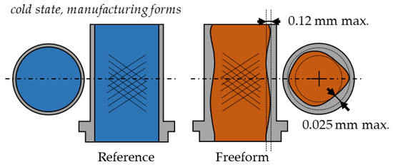 Based on the knowledge of the deformation of the reference liner, the free-form liner is designed inversely that way to be straight and cylindrical at the hot operational state (Figure 6). The free-form liner has a maximum cylindrical deviation of 0.025 mm radial and a lateral deviation of 0.12 mm radial. To produce the developed form, a method was developed at the Institute of Manufacturing Technology and Machine Tools, enabling the creation of a machined free form during a machining step with an innovative machining tool [10]. The reference cylinder liner was manufactured close to series production. Despite the different shapes, the cylinder liners have similar surface roughness parameters.