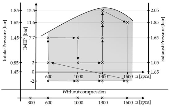 The experimental study with the Floating-Liner engine covers different operational points. First, a study is performed without compression (cylinder head disassembled) for rotational speeds of 300/600/1000/1300/1600 rpm. The main experiments are performed with compression in a motored operation mode (presented by the negative IMEP, due to wall heat losses) and with different loads up to 15.5 bar IMEP for rotational speeds between 600 and 1600 rpm, as is shown in Figure 7.