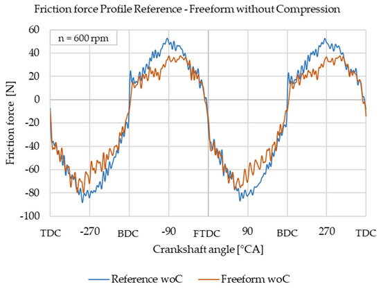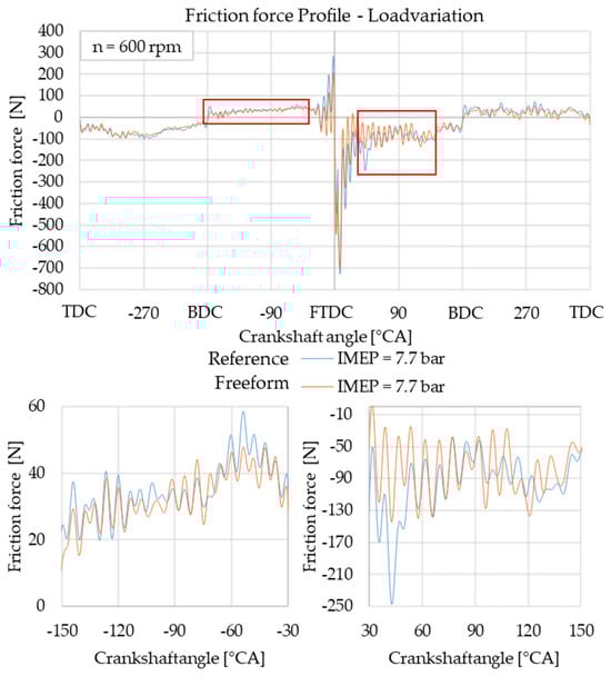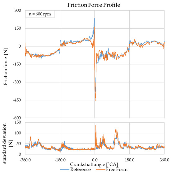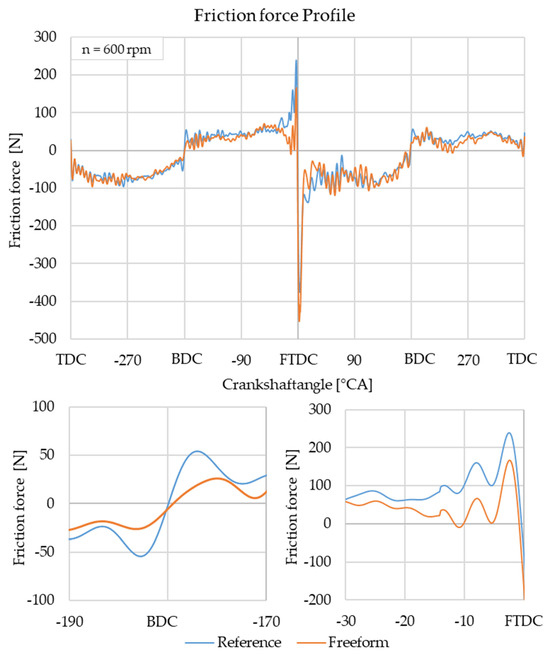 For exemplary representation of the friction force profiles, Figure 13 depicts the friction forces at the lowest speed, n = 600 rpm, without combustion. This minimizes the impact of oscillations on the overall trend in the measured data. This representation allows for a cycle-dependent analysis of friction forces. The friction force profiles over the 200 averaged working cycles show minimal macroscopic differences between the examined cylinder liners for the parts with higher velocity between the turning points. The effects elucidated in Section 4.1 for hydrodynamic friction between the reversal points are not continuously evident along the stroke. In the region near the TDC, significant increases in friction force are observed due to the compression cycle. The free-form liner shows clearly reduced friction from about −30 °CA on, as it approaches the TDC. The improved roundness of the free form ensures an enlargement of the lubricating film-building surfaces of the piston rings, expanding the hydrodynamic region of friction. Despite the acting combustion chamber pressure, the collective load can be influenced in such a way that hydrodynamic friction persists at low relative velocities. Additionally, the force jump at the TDC for the free-form honed liner is smaller than that of the reference. This may result from the diminishing clearance and the consequent expansion of the hydrodynamic friction area at lower relative speeds, leading to a reduction in solid friction. This could additionally be supported by minimizing piston tilting, by a better guidance, leading to a substantial increase in the effective contact area and a decrease in contact pressure.