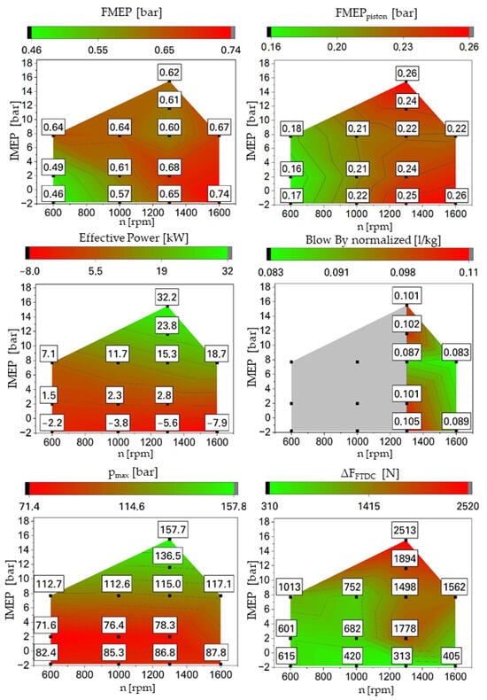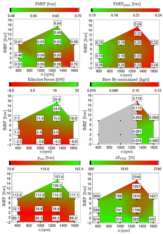Near the fired top dead center (FTDC), the friction force reaches its maximum; therefore, the value ∆FFTDC is also evaluated. The friction mean effective pressure of the piston (FMEPP) is a part of the total engine friction, commonly described by the mean effective pressure (FMEP) of the whole engine. The values FMEPP and the effective engine power Pe serve as references for the friction force measurements. Additionally, blow-by flow and the maximum cylinder pressure (pmax) are considered to assess the sealing of the combustion chamber against the crankcase.