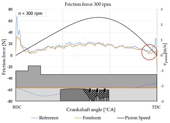 Figure 12 exemplifies the friction force profile for an upward stroke (−180 °CA–0 °CA) at 300 rpm without compression combined with a draft of the sectioned cylinder liner to depict the bore diameter in the warm operation state (only thermal deformation due to operation without compression).