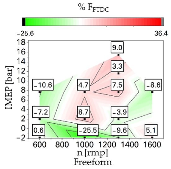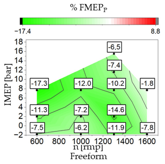 To analyze the friction reductions across the entire operating map, the percentage changes in piston group friction are depicted in Figure 14. The reference liner serves as the baseline for comparison. Figure 14 shows significant advantages for the free-form liner, particularly at low speeds and high indicated mean effective pressures. The most substantial reduction of 17.3% for the free-form honed cylinder liner occurs at a speed of n = 600 rpm and an indicated mean effective pressure of IMEP = 7.7 bar. The comparison shows, further, that the free-form variant induces reductions in piston group friction over the entire operating map. Here, the influence of the basic design idea is clearly visible. According to that design, the operated liner being heated from the combustion process has a form which is obviously nearer to a cylindrical shape, thus reducing the averaged friction. The presented results demonstrate that the designed free-form honed cylinder liner achieves significant reductions in the friction for the piston group of up to 17.3%, with an average reduction of 9.3% across the investigated operating map. This corresponds to an averaged power advantage of 0.103 kW.