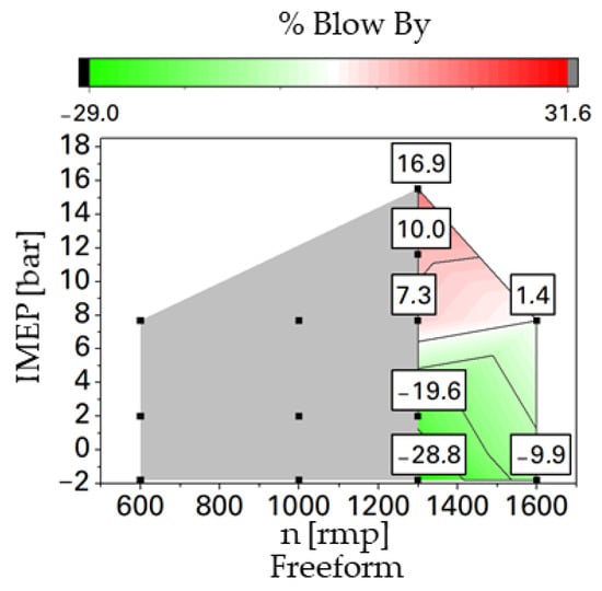 Figure 17 presents the measured blow-by values for evaluating the sealing behavior of the piston group, again as the relative change in the free-formed liner in comparison to the reference liner. Due to the utilized measurement system, as indicated before and described in [11], only speeds n > 1200 rpm can be considered. Generally, the blow-by losses increase with higher indicated mean effective pressure, as the compression and combustion pressure increases. For the investigated free-form honed liner the increase in blow-by at high IMEP is even stronger that for the reference form, as can be seen in the relative change in the blow-by in Figure 17. For the highest operating point, the blow-by increases up to 16.9% of the reference. For lower IMEP, the free-form honed liner shows much smaller blow-by with measured reductions up to −28.8%. The measurements of the blow-by show an operating-point-dependent behavior, indicating a suboptimal design of the free-formed liner.