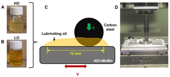 Lubricants and frictional experiments: the high viscosity (HO) (A) and low viscosity (LO) (B) lubricating oils and the ball–plate reciprocating friction model (C,D) were used.