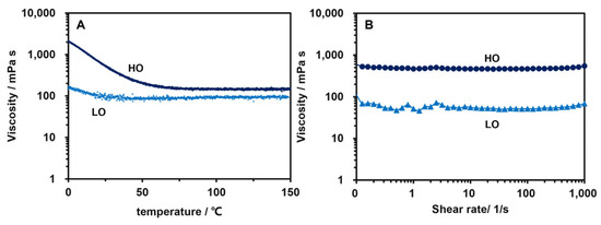 Rheology properties of the HO and LO lubricants under the increasing temperatures (A) and shear rates (B).