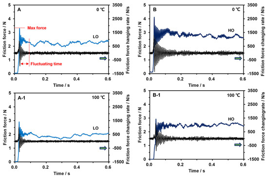 The initial fluctuation of friction under different starting temperatures at 0.1 Hz and 20 N: the LO (A) and HO (B) at 0 °C, and the LO (A-1) and HO (B-1) at 100 °C.