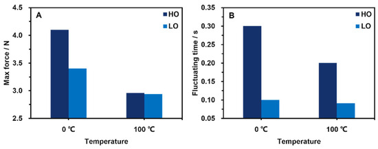The initial max friction force (A) and fluctuating time (B) of LO and HO lubricants under 0 °C and 100 °C.