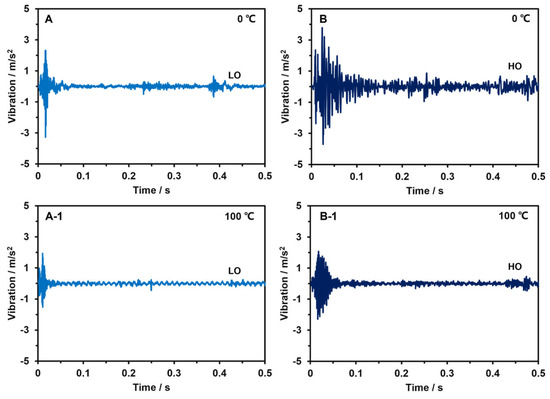 The frictional-induced vibrations under different starting temperatures at 0.1 Hz and 20 N: the LO (A) and HO (B) at 0 °C and the LO (A-1) and HO (B-1) at 100 °C.