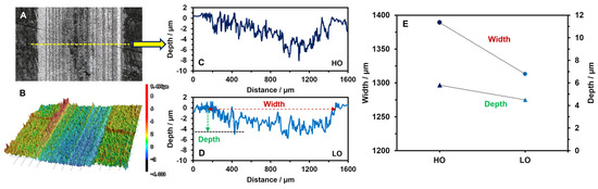 Figure 7 depicted the surface topographies of the 42CrMnMo surfaces that were treated under HO and LO lubricating conditions. The worn scratch and its three-dimensional shape of the HO lubrication were displayed in Figure 7A,B, and it was noticed that the worn scratch had a significant depth and width. It was evident from Figure 7C,D that the utilization of the LO led to a substantial reduction of more than 20% in the depth of wear. Specifically, the depth of wear decreased from 5.8 μm when lubricated with HO to 4.3 μm when the LO was applied. Figure 7E demonstrated that the LO yielded a smaller worn width value of 1322 μm compared to the HO value of 1395 μm.