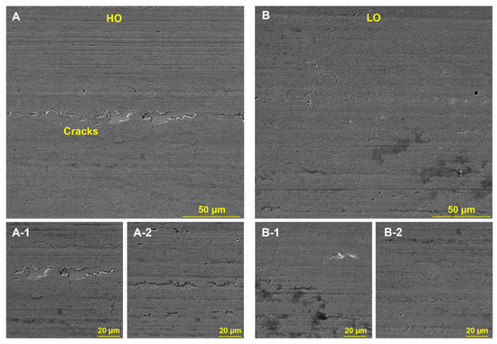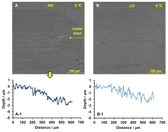In Figure 8, the surface morphologies of the 40CrMnMo material were depicted under the influence of the HO and LO lubricants, and specifically, attention was paid to the worn morphologies on the initial process. Owing to the reciprocating model being reproduced as a rapid sliding movement that begins from a stationary state frequently, the wear morphology at the first location could be regarded as the result of numerous start-up frictions. Figure 8A shows that the noticeable cracks and grooves occurred on the worn surface with the HO lubricating oil. The low fluidity of the HO limited the spread of the lubricant around the contacting interfaces at the onset of friction, and the poor or boundary lubricating conditions caused direct contact of the frictional pairs. Under the effect of shear force and applied load, the deformations were generated and were exacerbated by the frictional effects. As a result, the higher worn depth at the initial location was observed at 3.2 μm (Figure 8(A-1)). However, because of the high fluidity of LO, which conferred lubrication capabilities for the purpose of smoothing the deformed surface, the rapid creation of a lubricating layer during the initial contact period was made possible. Therefore, the application of the LO lubricating oil led to the almost smooth worn surface with tiny grooves and contributed to a worn depth of less than 2.1 μm (Figure 8(B,B-1)).