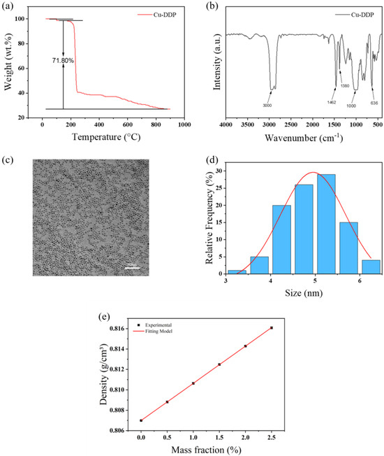(a) TGA curves, (b) FTIR spectra of CuDDP, (c) TEM image of CuDDP, (d) and particle size distribution of CuDDP. (e) Density of CuDDP and PAO4 mixture changes with CuDDP mass fraction.
