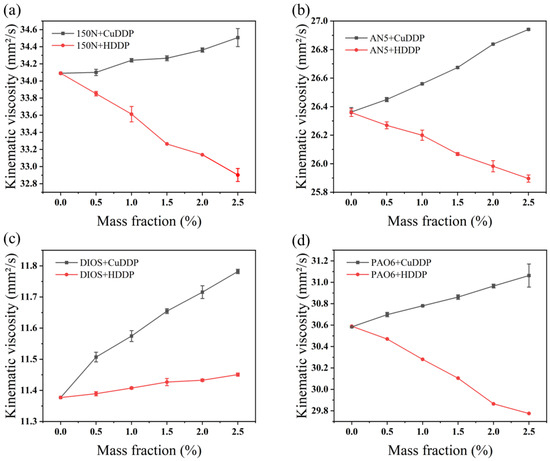 Effects of CuDDP and HDDP on kinematic viscosity of different base oils at 40 °C: (a) 150N, (b) AN5, (c) DIOS, (d) PAO6.
