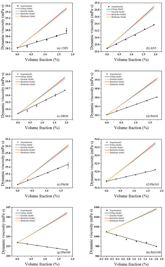 The theoretical viscosity values of different base oils with CuDDP were calculated with Equations (4)–(6) and compared with the experimental values shown in Table 4. Pronounced discrepancies were observed between the predicted viscosity values and those obtained experimentally. Notably, the greatest deviations forecast by Einstein’s formula, Batchelor’s formula, and Brinkman’s formula were 7.7%, 7.9%, and 7.9%, respectively. As can be seen in Figure 3, the predicted viscosity values of different base oils tend to increase with the increase in volume fraction of the nanomaterial. The experimental values are lower than predicted ones, which implies that—aside from the shear resistance of the nanoadditive—there are also other factors that cause decreased experimental viscosity values of the lubricants. In addition, the nanoadditive CuDDP leads to increased viscosity in low-viscosity base oils 150N, AN5, DIOS, PAO4, PAO6, and PAO10, as well as decreased viscosity in high-viscosity base oils PAO40 and PAO100. The reason might lie in that the nanoadditive mainly affects the viscosity of the base oil by an anti-shear effect [30], which is more significant in low-viscosity base oils. In high-viscosity base oils, the shear resistance of CuDDP is relatively small, which corresponds to its reduced anti-shear effect and the viscosity of the base oils.