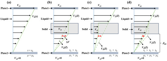 In Equation (7), α is the fitting coefficient, and its value is presented in Table 5. The discrepancy between the dynamic viscosity value derived from Equation (6) and the empirically measured value is observed to be less than 0.5%, and the correlation coefficient R2 is greater than 0.99, which indicates that the fitting equation can better describe the influence of CuDDP on the viscosity of the base oils. Furthermore, based on molecular dynamic simulations and experimental studies, we also established a mechanistic model to describe the solid–liquid interfacial slip behavior and shear viscosity of lubricants in relation to nanomodulation [33]. With the assumption that a fluid is a Newtonian fluid with constant viscosity, a rigid solid would not be deflected upon insertion into the liquid, nor would it be subjected to any inertial force in the flow field. In this case, the shear slip motion is only concentrated on the upper surface of the solid. As seen in Figure 4a, the velocity of the upper shear plate is vx1, and the lower shear plate is static. In a pure liquid, the flow velocity distribution is V0(z), the shear stress is τ0, and the viscosity is μ0. When no solid is added, the shear stress in the Zh0 height range of the liquid would be τh1 = μ0v1(Zh0)/Zh0 = μ0vs1/Zh0, and the shear stress in its Zh0 height range would be τh0 = μ0v0(Zh0)/Zh0. When solids are added to the liquid in the absence of interface slip (Figure 4b), both the upper-surface velocity and the lower-surface velocity of the solids are Vs1. In this case, we have Vs1 > V0(Zh0) and τh1 > τh0, as well as a total stress of τ1 > τ0 and a total viscosity of μ0 < μ1, which corresponds to the Einstein model. When the interface slip effect is significant (Figure 4c), we would have vs2 < v0(Zh0) and a total viscosity of μ2 < μ0, which corresponds to the experimental value in Figure 3a–f. When the interface slip is less than the shear resistance caused by the solid (Figure 4d), we would have vs1 > vs3 > v0, a total stress of τ1 > τ3 > τ0, and a total viscosity of μ1 > μ3 > μ0, which corresponds to the experimental values in Figure 3g,h.