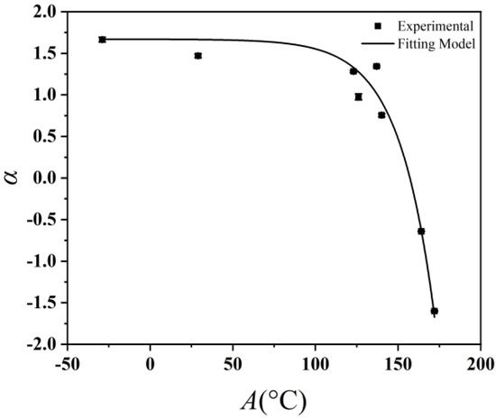 The aniline point is the lowest temperature required for the oil and an equal volume of aniline to dissolve into a single liquid phase with each other. It serves as a measure of the aromatic content in oil and can also reflect the polarity of lubricating oils [34]. Here, we use the aniline point to represent polarity and reflect the interfacial interactions. Table 6 displays the aniline point test outcomes for the analyzed base oils, and there are discernible correlations between the viscosity of polyalphaolefins and their aniline points. Through fitting the experimental data presented in Table 5 with the aniline point, the coefficient α can be articulated as follows: