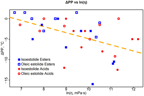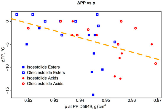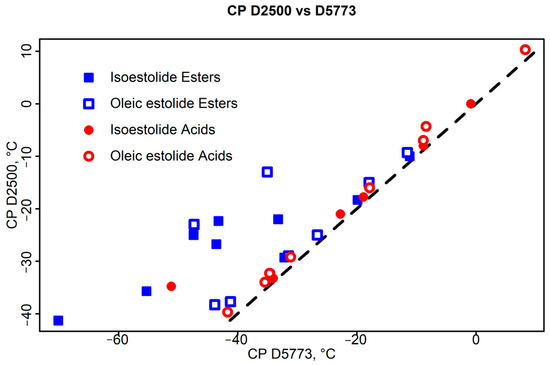 The comparison of the two methods can be seen in Figure 4. Equation (3) shows the best fit of the data. The tendency was for D97 to report slightly lower PP, as seen by the >1 coefficient. Introducing an intercept or quadratic term was not statistically significant. Accounting for acids vs. esters in the Equation (4), using the variable = 0.5 for esters and = −0.5 for acids was statistically significant (p = 0.036 < 0.05). The acid–ester difference of 3.1 °C is slightly higher than the resolutions of the methods (3 °C).