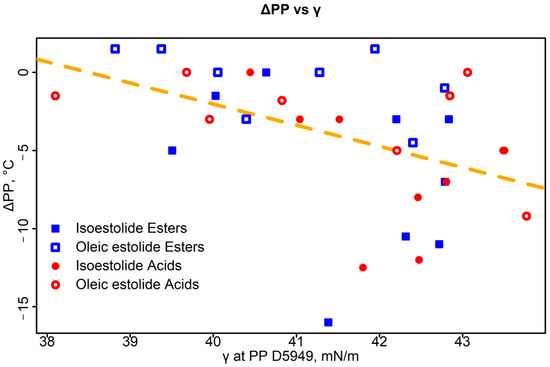 The ΔPP presented as a function of the estimated surface tension at the PP from D5949. The dashed orange line is a linear fit through all the datapoints.