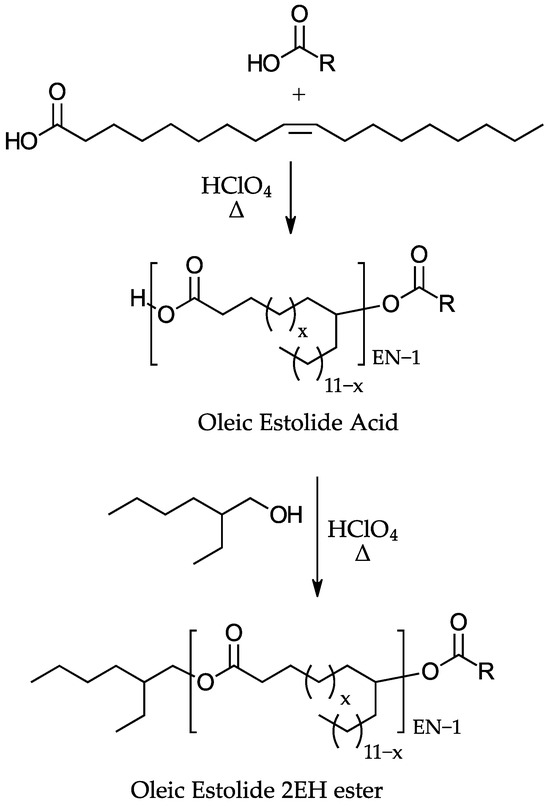 The oleic estolides are synthesized by the two-step procedure [34] (See Scheme 1). In the first step, a mixture of oleic acid, a capping saturated fatty acid, and a catalyst (perchloric acid) are heated to form oligomeric estolide acids. Afterwards, the estolide acids are distilled to remove the unreacted fatty acids and lactone by-products. In the second step, the estolide acids are esterified with 2-ethylhexanol to form estolide 2-ethylhexyl esters (estolide 2EH esters). The oleic–oleic estolide is synthesized without a saturated fatty acid. Due to the strong acid catalyst, the double bond migrates along the fatty acid chain and isomerizes from cis- to trans- [34].