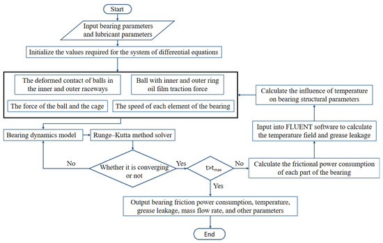 Firstly, the working condition parameters and structure parameters of the bearing are input, and the differential equations of bearing dynamics are established [30]. The Runge–Kutta method is used to solve. When the results converge, six kinds of friction power consumption in the bearing are calculated. Then, the friction power consumption is input into Fluent for simulation analysis, and the temperature, grease leakage, and grease flow rate are solved. Then, the influence of the temperature on bearing parameters and friction power consumption is calculated to achieve the coupling analysis.